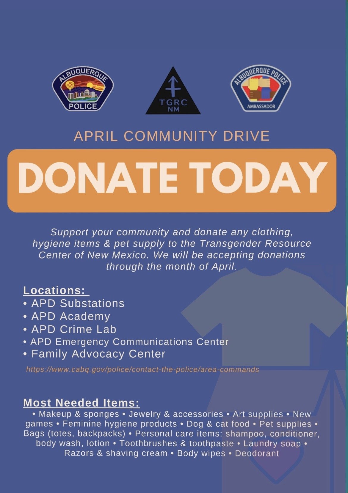 Support your community and donate any clothing, hygiene items & pet supplies to the Transgender Resource Center of New Mexico. We will be accepting donations through the month of April.