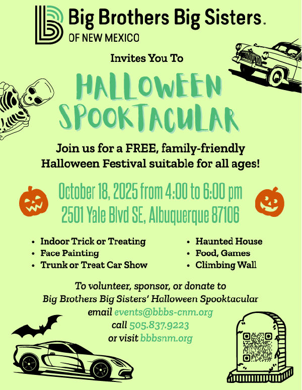 Volunteers are needed to help with set up and clean up, guest check-in, face painting, getting the cars parked, directing foot traffic, etc. For more info about the event and to sign up, please visit our website https://bbbs-cnm.org/events/spooktacular/.