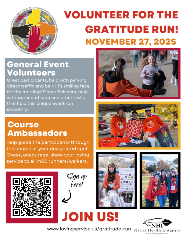 Native Health Initiative is seeking volunteers for our 10th Annual Gratitude Run/Walk taking place on Thanksgiving morning (11/27/25) at Arroyo del Oso Park. We're seeking general event volunteers and course ambassadors. Help direct the projected 1500 attendees on this marvelous gathering of community and thanks.