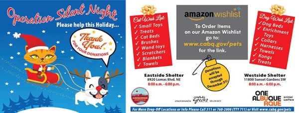 Operation Silent Night Donations are starting to come into the shelter. We need assistance in receiving, sorting and distributing the holiday shelter donations for the pets.