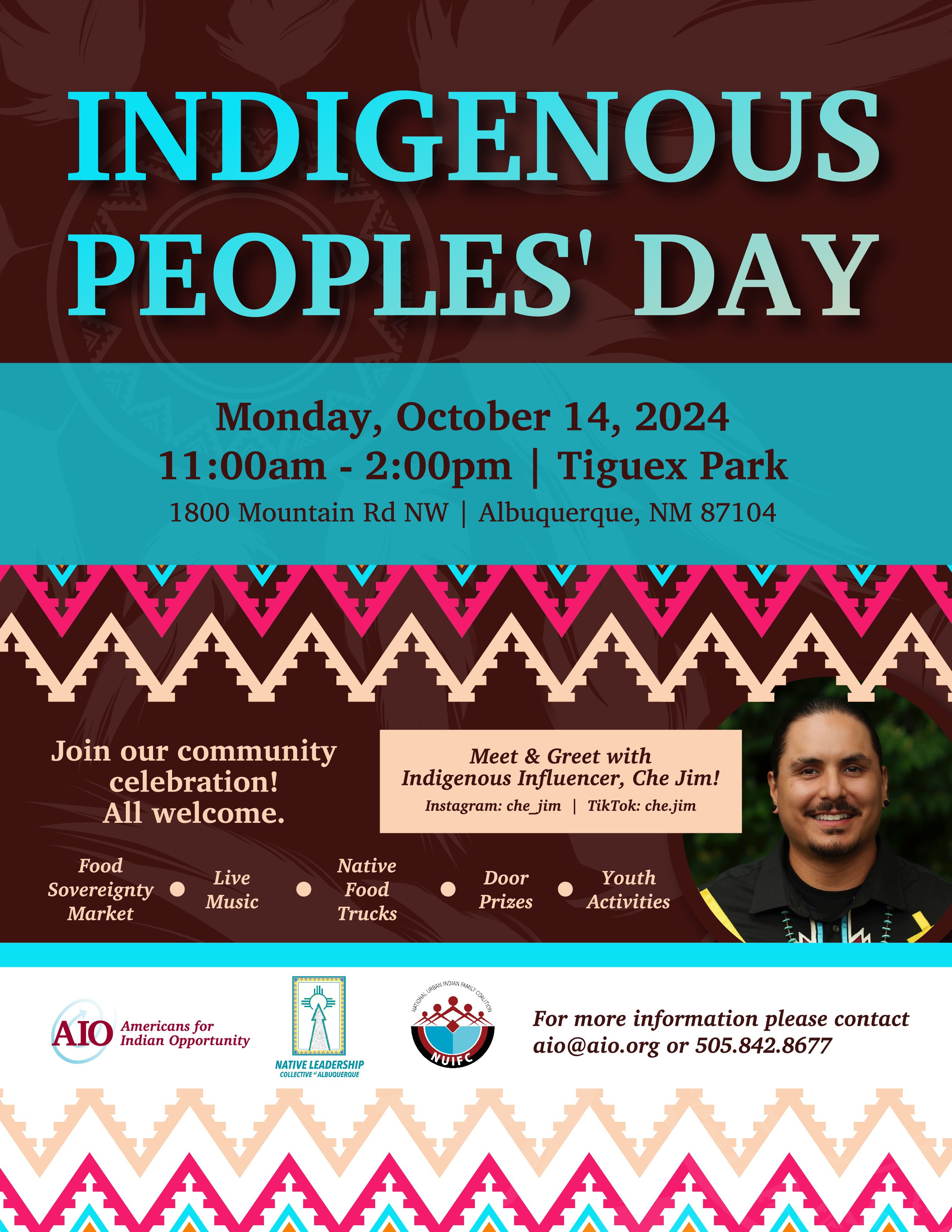 Free Community event to celebrate Indigenous Peoples' Day at Tiguex Park. Get Out The Vote, Music, Food, Entertainment, Meet and Greet with Che Jim.